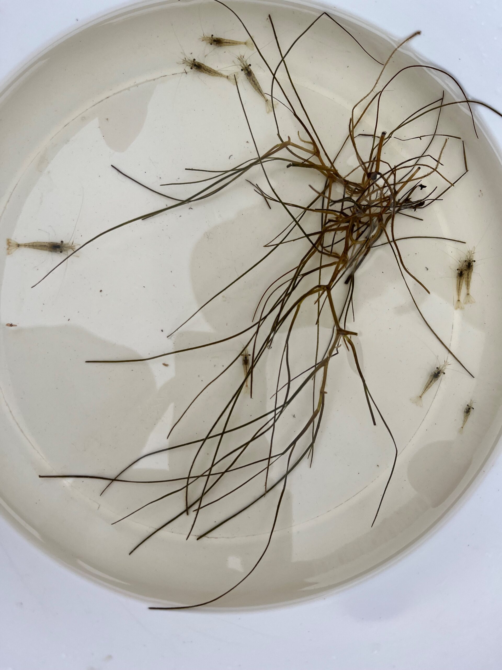 Första försöket att se brackvattensräka, vid Stockesundets östra inlopp, lades snabbt ner då förhållandena inte såg gynnsamma ut där. Komna till våtmarken vid Flatö Sörgård möttes vi av markägaren Sven Jansson som berättade om projektet, som var färdigt 2023. Den tidigare ganska vattensjuka betesmarken har nu blivit en grund vattensamling med naturligt tillopp och ett nivåreglerat utflöde. Kanterna har redan blivit beväxta med bl.a. kaveldun och en del andra vattenväxter. Vattenytan har lockat till sig änder och insektsjagande svalor och grodor och paddor har också observerats.